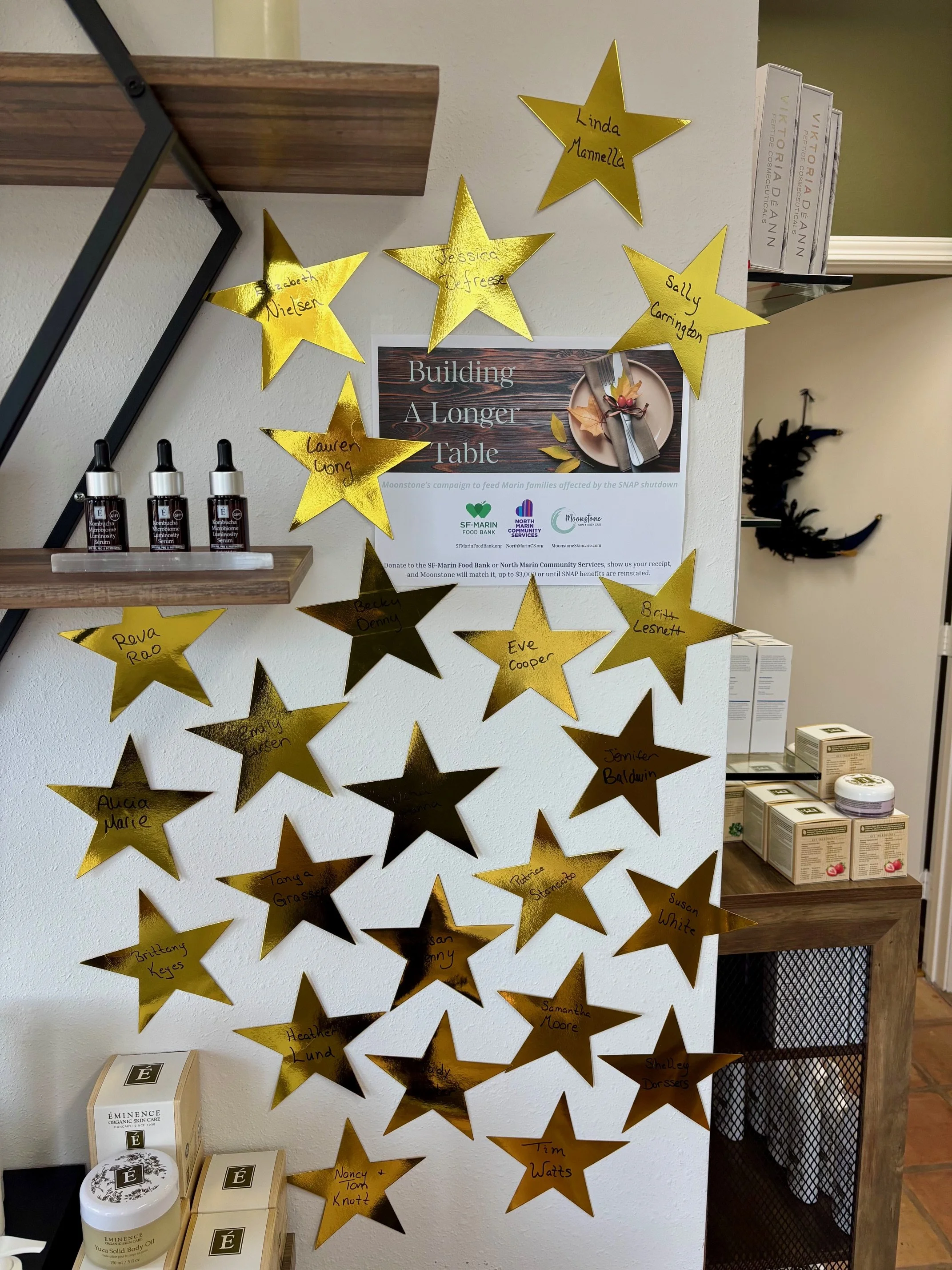 Together, our Moonstone community donated $2,330 to the SF–Marin Food Bank and North Marin Community Services. And because we promised to match every dollar, Moonstone matched that $2,330. That means $4,660 went straight to feeding local families who needed it most. See all the stars who generously donated to feed our local community!