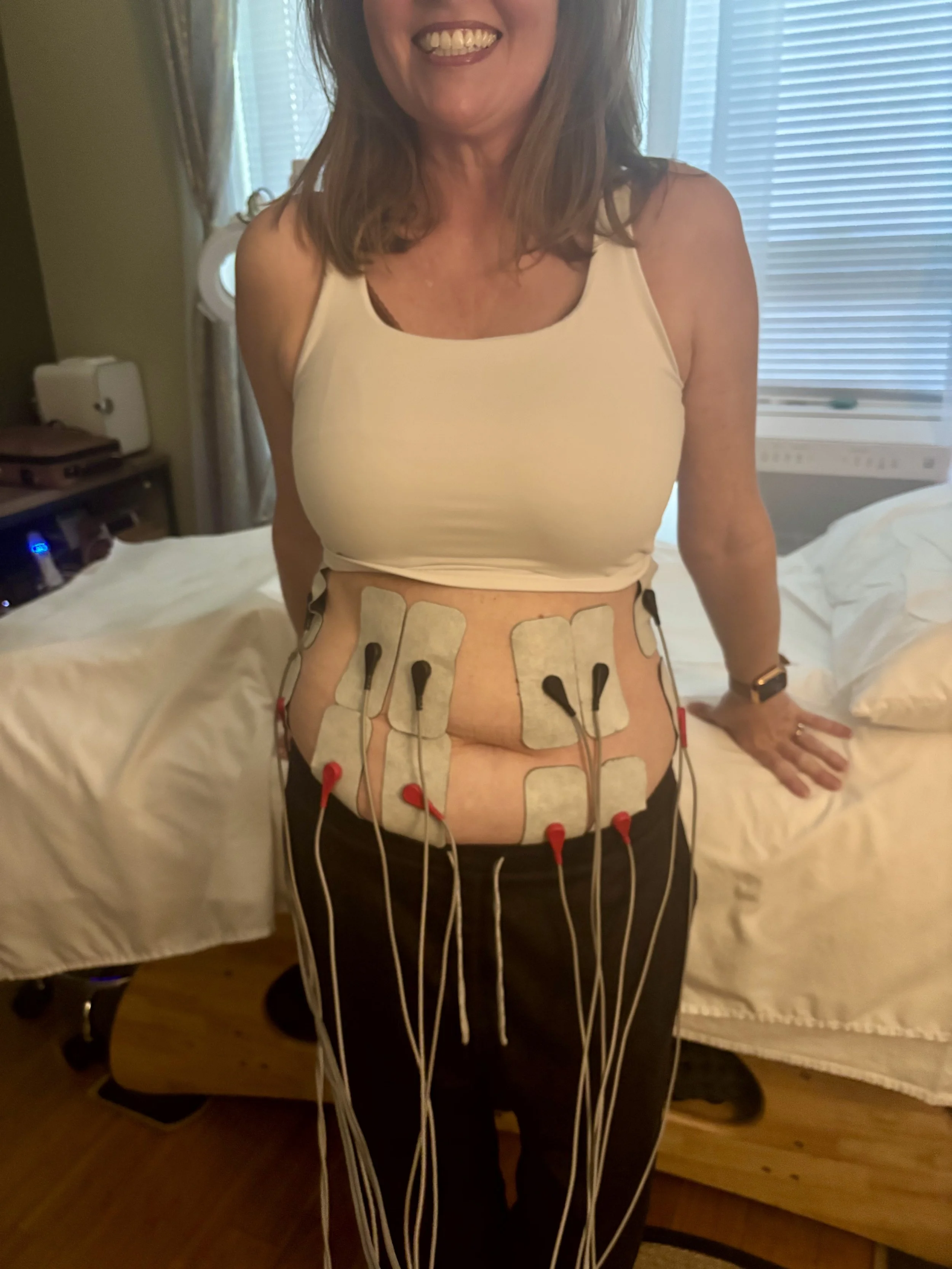 Hope hooked me up to the microcurrent pads—belly, sides, and back—and started me on Level 1: Relax. It felt like a warm, buzzy hum. Like someone snuck a beehive under my skin but the bees are licensed massage therapists. I hung out there for about 10 minutes.